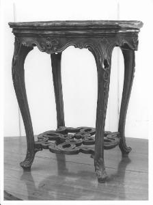 gambe incurvate ad esse raccordate da traversa sagomata con motivo a nastro intrecciato, fascia di sostegno mossa, piano dal profilo sagomato