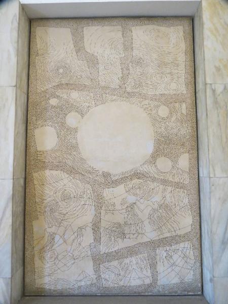 Pannello in compensato di legno raffigurante la formazione dell'universo, del sistema solare e della terra. Nella parte superiore è rappresentata la formazione degli astri, in quella inferiore l'attività lavica dei vulcani e le prime formazioni cristalline.