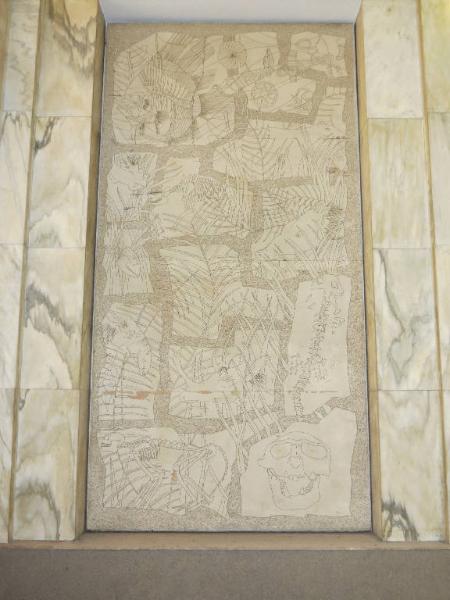 Pannello in compensato di legno raffigurante l'Era Terziaria. Nella parte superiore vi sono forme di vita marina con un pesce osseo e conchiglie. Compaiono i mammiferi e i primati, affiancati a fossili e schelettri.