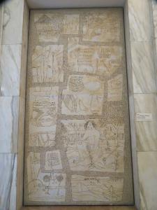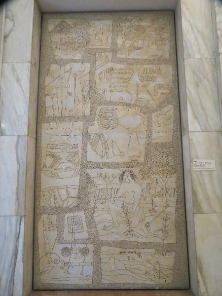Pannello in compensato di legno raffigurante il Periodo Quaternario. Le conquiste culturali dell'uomo nel Neolitico sono rappresentate dagli insediamenti stanziali, dalla costruzione di strutture architettoniche lapidee come le tombe, dalla produzione di manufatti per la caccia e di uso domestico, dalla scoperta della coltivazione e dalla navigazione.