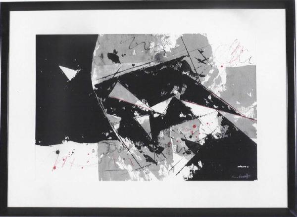 Opera non figurativa caratterizzata da una composizione libera di colori (nero e grigio) e segni. Qua e là per dare luce e movimento all'opera compaiono segni veloci rossi.