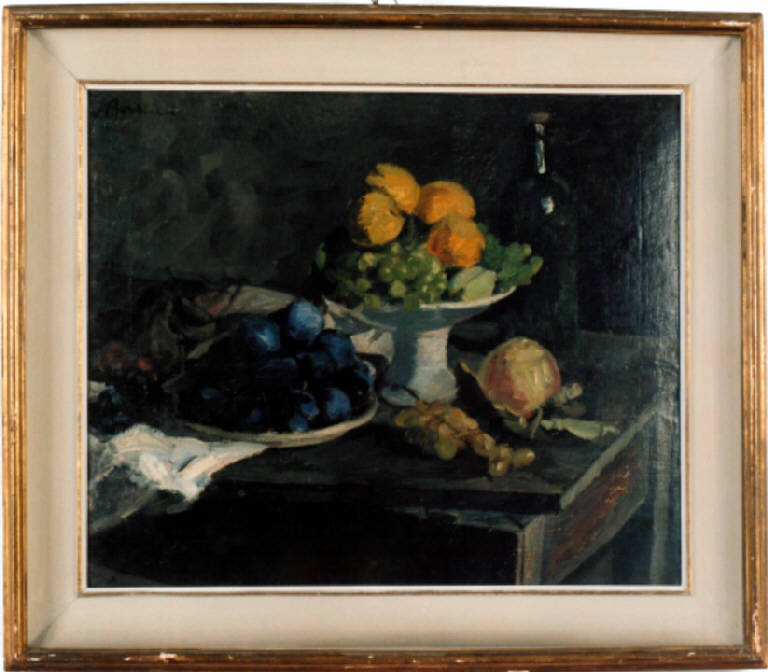 Natura morta. Natura morta con fruttiere e bottiglie