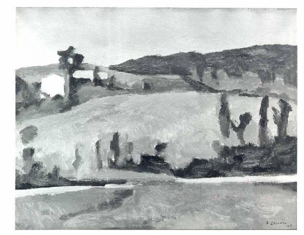 Opera pittorica che rappresenta un paesaggio collinare con case bianche e colline. La stesura è irregolare, a volte materica, a volte diluita. La luce è forntale.