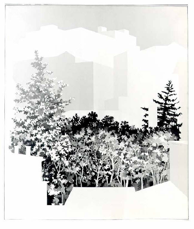 Opera che rappresenta un giardino alberato tra palazzi bianchi geometrizzati. Il colore è freddo, sfumato.