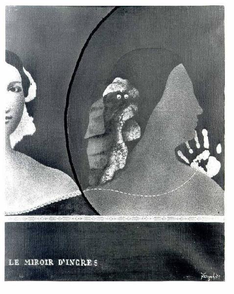 Opera pittorica costruita su una struttura statica in cui un ritratto femminile a metà, ricavato da un'oera di Ingres è riflesso di profilo in uno specchio. La luce è contrastata. Sulla tela sono incollati a scopo decoratrivo pizzi e nastri.