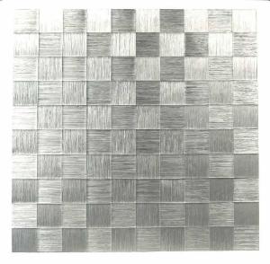 Opera pittorica costruita sul modulo ripetuto del quadrato. Un tratteggio alternativamente verticale e orizzontale crea un movimento ritmico e continuo della luce. La struttura a texture ha un andamneto regolare. \nLa luce è contrastata. La tela è iuta e la superficie di colore è in riliervo.
