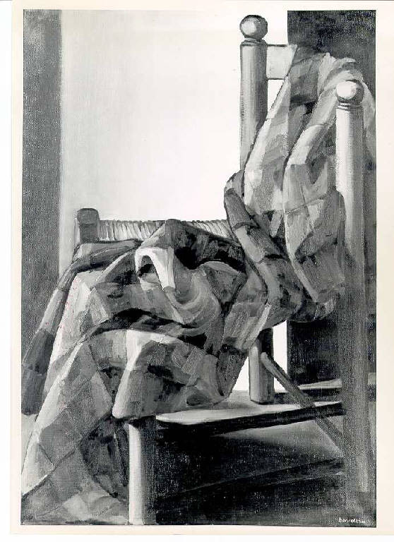 Opera pittorica che rappresenta una sedia impagliata con appoggiata una coperta dai colori vivaci. La luce è contrastata.