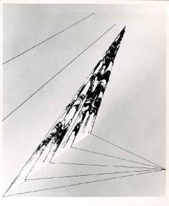 Opera pittorica con in primo piano, al centro un trinagolo regolare da cui parte la proiezione ortogonale. In alto, a sinistra due segni obliqui.\nIl colore è freddo; la stesura sottile, uniforme.\nLa linea è obliqua, curva, ondulata, sottile, nitida, uniforme, modulata, a tratto.