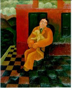 Opera pittorica con in primo piano, al centro una figura maschile con un cane in braccio, seduta su una poltrona dall'alto schienale e collocata all'interno di un ambiente dal pavimento a scacchiera e dalle finestre chiuse. A sinistra e in alto la stanza lascia vedere un paesaggio collinare con il cielo nuvoloso. Il colore è tonale; caldo; sfumato. La luce è contrastata.