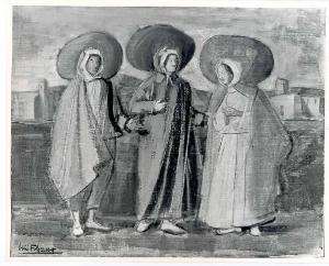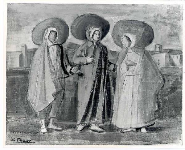 Opera pittorica con in primo piano due donne e un uomo in costume con un grande cappello e ampio mantello si incontrano. In fondo un paesaggio di campagna con una chiesetta a sinistra e case a destra. Il colore è tonale; caldo; sfumato. La stesura è veloce e la luce è laterale.