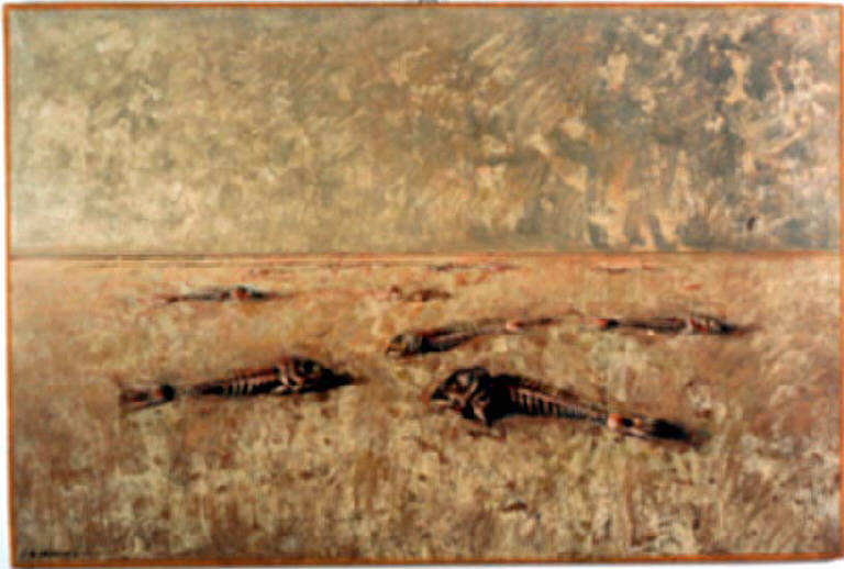 Opera pittorica che rappresenta in primo piano, distese su una sabbia grigia e spenta alcune lische di pesce disposte in ordine sparso. In fondo il mare è sovrastato da un cielo nuvoloso e grigio. La stesura è irregolare, frammentata e veloce. Il colore prevalente è il marrone chiaro e grigio. \nStruttura: statica. Luce: diffusa.