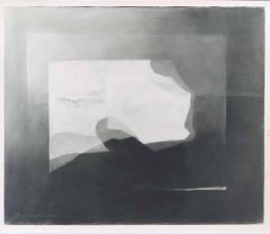 Opera pittorica caratterizzata da forme libere, geometriche e non, che ricordano, nell'inquadratura e nel senso spaziale, un paesaggio visto in lontananza. Colore: blu azzurro in gradazione e all'interno bianco. La luce è contrastata.