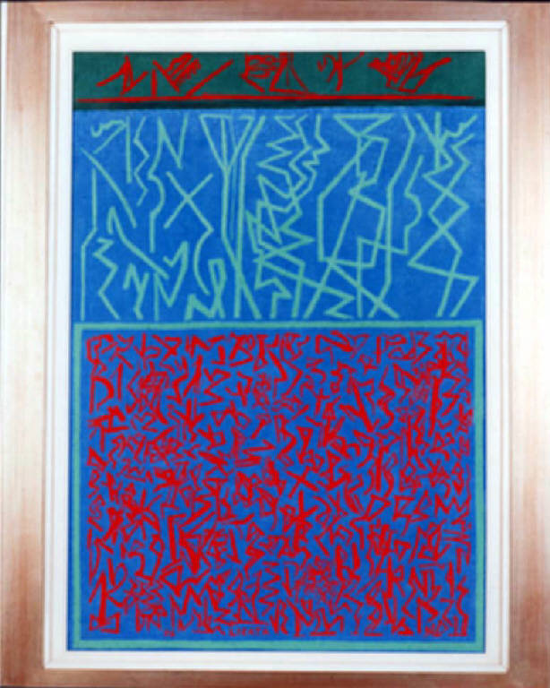 Opera pittorica in cui lo spazio compositivo è diviso in tre fasce orizzontali di altezza differente al cui interno si dispongono segni-scrittura di dimensioni e forma diversa e di colore alternato, chiaro, scuro, chiaro. Il colore è caldo; piatto. La stesura è sottile; uniforme. La luce è contrastata.