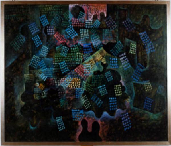 Opera pittorica costituita da una composizione di forme chiuse curvilinee e di segni liberi che riempono lo spazio compositivo, differenziandosi soprattutto attraverso il chiaroscuro. La stesura è veloce e nervosa. La struttura è dinamica e la luce è contrastata.