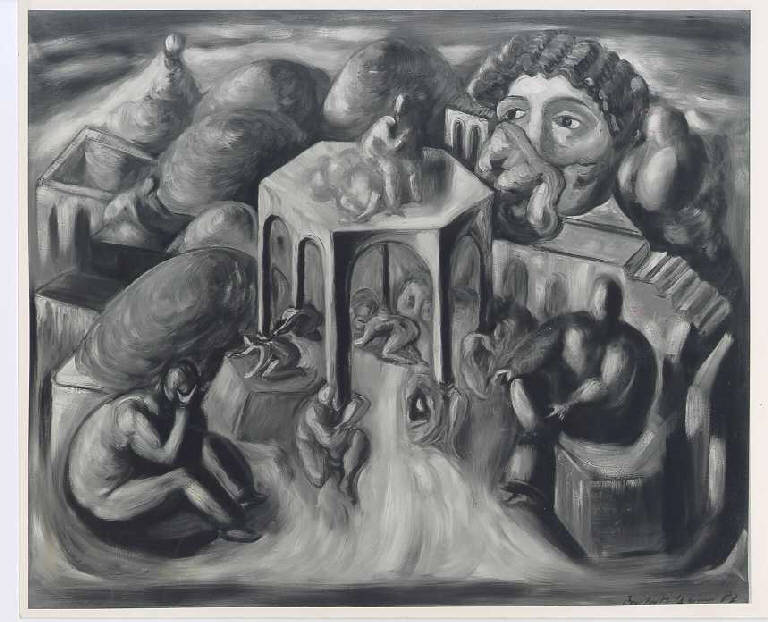 Paesaggio inventato e surreale composto da colline arrotondate,da elementi architettonici e personaggi di dimensioni diverse. Al centro edicola con archi prospetticamente sfalsata, sostenuta da personaggi appena abbozzati su cui appoggiano i pilastri. Attorno, disposte in senso semicircolare sono collocate altre architetture, colline e personaggi semplificati e senza volto. Nel piano di fondo emerge una grande testa maschile, parzialmente coperta dalle montagne. Colore: tonale; sfumato; freddo. Stesura: spessa; corposa. Luce: contrastata, laterale.