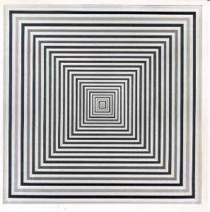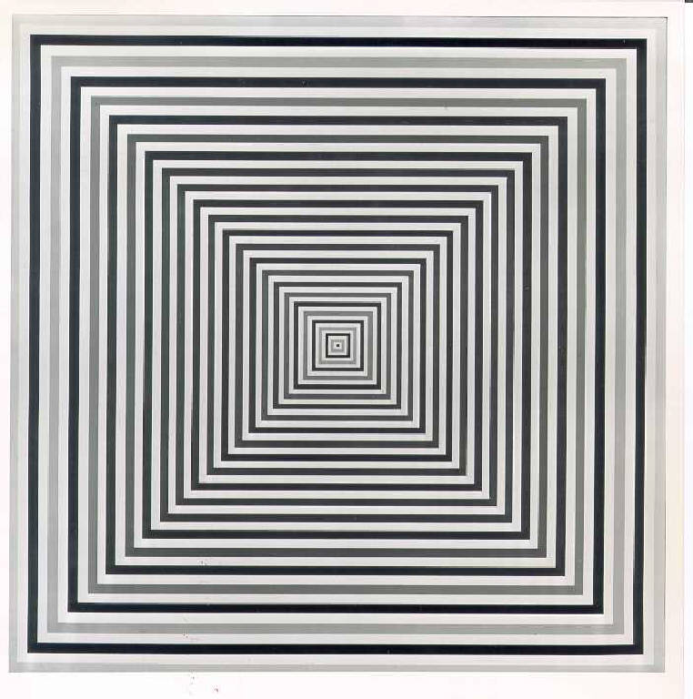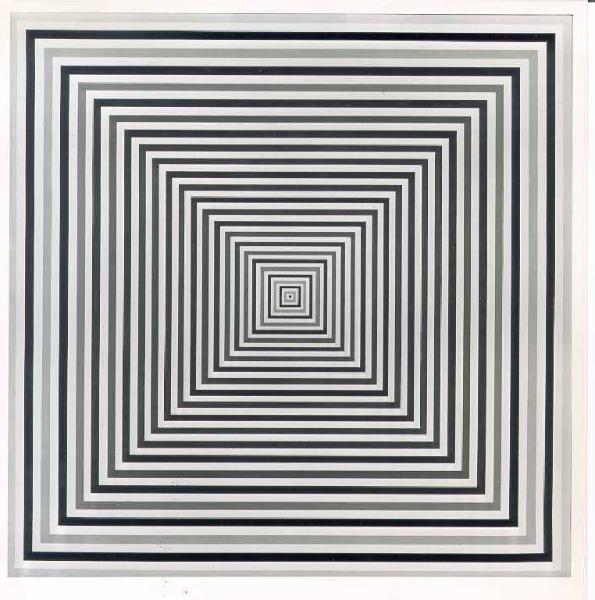 Opera pittorica caratterizzata da una composizione di quadrati concentrici che determinano un effetto ottico di profondità e di movimento.\nIl colore è piatto; caldo. La stesura è sottile; uniforme. La struttura è dinamica.