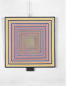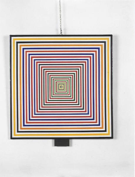 Opera pittorica caratterizata da una composizione di quadrati concentrici che determinano un effetto ottico di profondità e di movimento.\nIl colore è piatto; caldo. La stesura è sottile; uniforme. La struttura è dinamica.