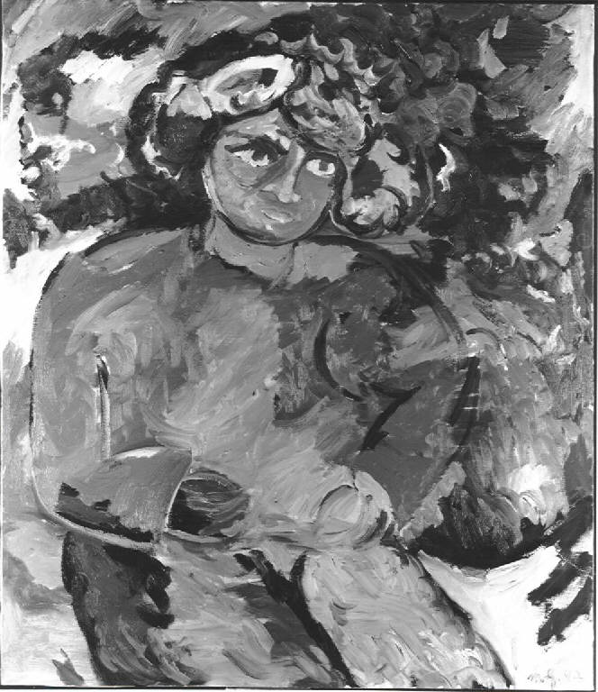 In primo piano figura machile quasi frontale dipinta con un colore espressionista e un segno veloce e impulsivo. Il fondo partecipa della frammentazione del colore. Colore: cromatico; caldo; sfumato.\nStesura: veloce; frammentata. Luce: contrastata; laterale.