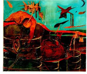 Opera pittorica che rappresenta un paesaggio surreale animato da esseri mostruosi e fantastici. In primo piano stanno tre contenitori cilindrici di diversa grandezza. In secondo piano a sinistra una figura umana di proporzioni gigantesche afferra un essere mostruoso dal contenitore più grande. Sul piano di fondo si apre un paesaggio desertico e infuocato, mentre altri mostri volano in cielo. Il colore è tonale; caldo (rosso); sfumato.\nLa stesura è corposa. La luce è contrastata.