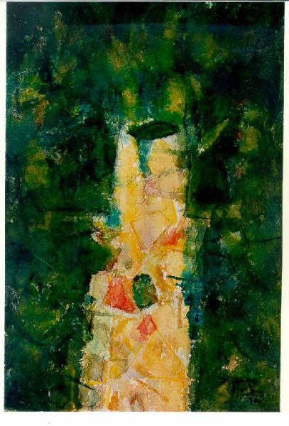 Opera pittorica in cui lo spazio compositivo è modulato da una serie di forme e di segni liberi e modulati dai colori caldi, bruni e verdi, che conferiscono l'idea di uno spazio naturale vivo e in movimento. Al centro si apre una struttura verticale a forma di totem contrapposta allo spazio rimanente dalla luce chiara e diffusa. Il colore è tonale; caldo (bruni, verde, giallo); sfumato. La stesura è grumosa; stratificata; a macchia.\nLa luce è contrastata; frontale.