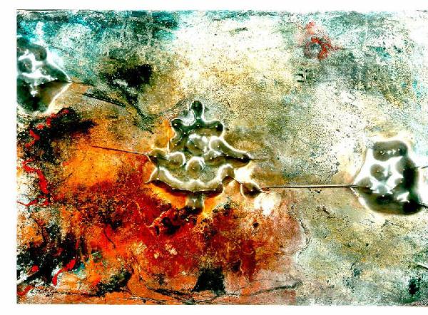 Opera pittoirca in cui lo spazio compositivo è mosso da una materia brulicante e magmatica rossastra a sinistra e grigia a destra, al centro della quale emergono tre protuberanze metalliche che conferiscono dimensione spaziale al dipinto. Il colore è tonale; caldo (rosso); freddo (grigio); sfumato.\nLa stesura è grumosa; veloce; sgocciolata; a rilievo. La struttura è dinamica. La luce è contrastata.
