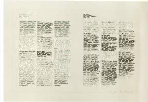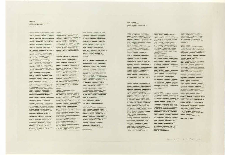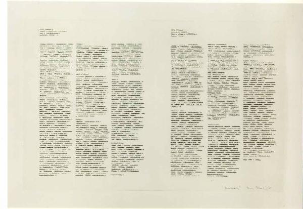 Lo spazio compositivo è diviso in due parti come le pagine di un quaderno aperto. Ogni pagina è internamente scandita da segni-scrittura disposti su tre colonne. Scrittura orizzontale, corsivo. Struttura: statica.