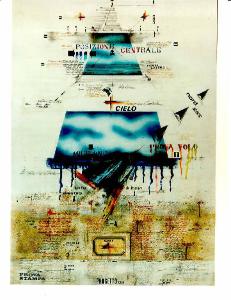 Collage costituito da una composizione di figure geometriche, linee, segni, parole, numeri secondo una struttura che rispetta la verticale centrale del dipinto. Al centro sono infatti evidenti due prove di stampa azzurro-cielo e i segni geometrici che evidenziano la centralità dello spazio. Il colore è sia freddo (azzurro); sia caldo (bruni). La stesura è sottile; uniforme.\nLa scrittura segue un andamento orizzontale, a stampatello, è manuale.\nLa struttura è statica. La luce è contrastata.