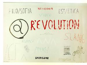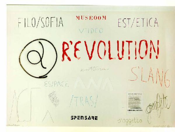 Scritte di dimensioni, grafie e colori differenti sono disposte in ordine sparso, come appunti veloci, in campo grigio uniforme, secondo un andamento orizzontale. Colore: piatto. Stesura: veloce.\nSegno: scrittura (orizzontale, stmpatello, corsivo, manuale, parole, lettere).