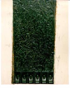 Sei sagome umane nere sono disposte al centro in basso, sovrastate e schiacciate da una larga massa cromatica nera, densa e grumosa che occupa quasi tutto lo spazio compositivo i cui bordi sono, per contrasto, bianchi. Colore: freddo (nero). Stesura: grumosa; veloce; a rilievo.