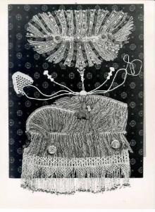 Al centro della tavola è posta una grande figura femminile riprodotta attraverso passamaneria, fili e bottoni in modo tale da trasmettere l'immagine di un grottesco vuoto soprammobile di cattivo gusto. Una grossa testa realizzata con la passamaneria e due bottoni rossi per gli occhi si erge su un collo sottilissimo, come le braccia. Il corpo, altrettanto sproporzionato, grosso e tozzo, richiama la forma degli ampi abiti delle dame di epoca barocca e termina con un corredo di frange in trasparenza. Il fondo è a tappezzeria scura con decori geometrici.