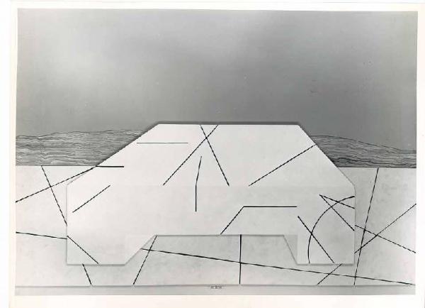 Al centro tavolo schematizzato nella sua forma geometrica semplice, appoggiato ad un piano orizzontale. Tavolo e piano sono intersecati e spezzati da linee oblique. Colore: cromatico; caldo (rosa, verde); piatto.\nStesura: uniforme; tesa. Struttura: statica.