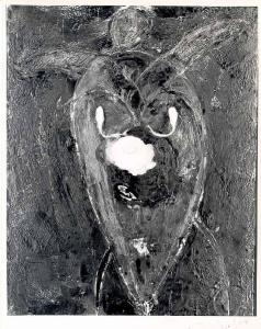 Al centro è disposto un grande insetto con la corazza visto dall'alto, ottenuto con un segno sintetico e veloce. L'insetto è in uno spazio indifferenziato e materico.