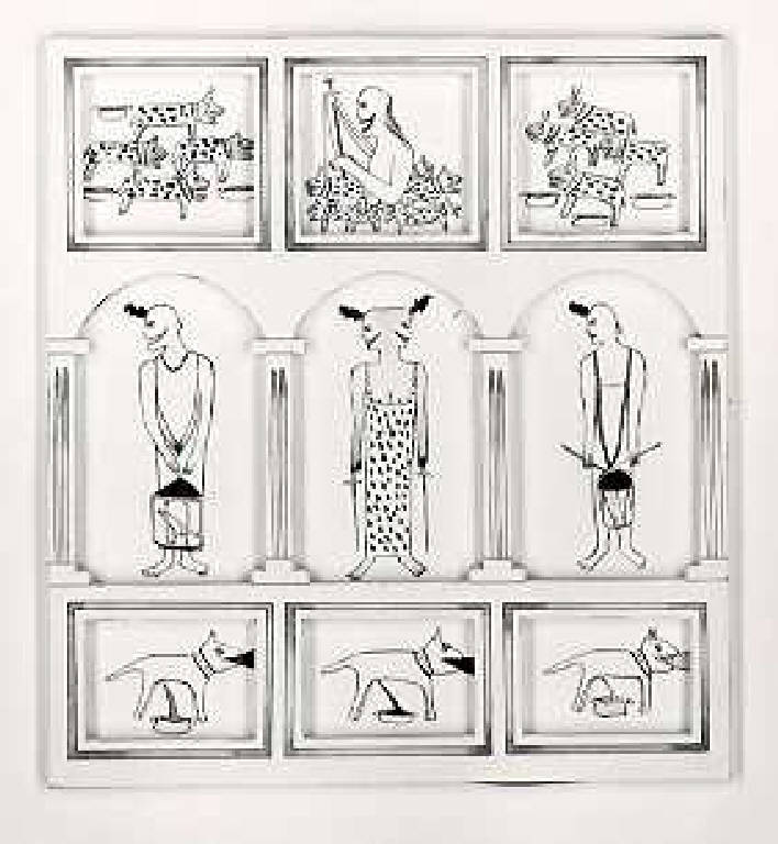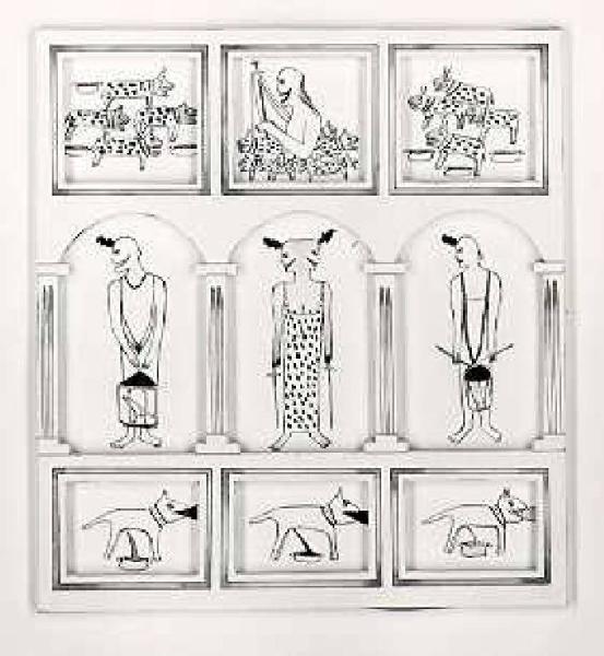 Opera costituita da un polittico ligneo composto da tre archi, tre predelle e tre cimase. Personaggi simbolici tribali e cani, ottenuti con segno nitido, semplice e infantile. Struttura: statica.