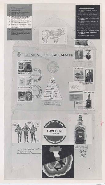 Collage di manifesti, buste, scritte, francobolli che hanno come tema Cavellini stesso. Partendo dall'alto: a sinistra "Il decalogo di Cavellini", a destra "Dieci modi per diventare famosi". Al di sotto la busta del Comune di Gallarate completamente aperta e una serie di nomi di importati artisti contemporanei. Al di sotto una serie di francobolli con la scritta Cavellini e la sua immagine. Chiude l'opera la rappresentazione multicolore dell'Italia.\nScrittura orizzontale, stampatello, corsivo, manuale, a stampa, parola, frase.