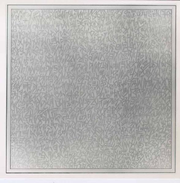 Composizione di segni-scrittura disposti secondo una struttura a texture riempitiva dell'intero spazio a disposizione.\nSegno: scrittura (in ordine sparso, stampatello, lettera, manuale).\nStruttura: a texture.\nStesura: uniforme; lenta.