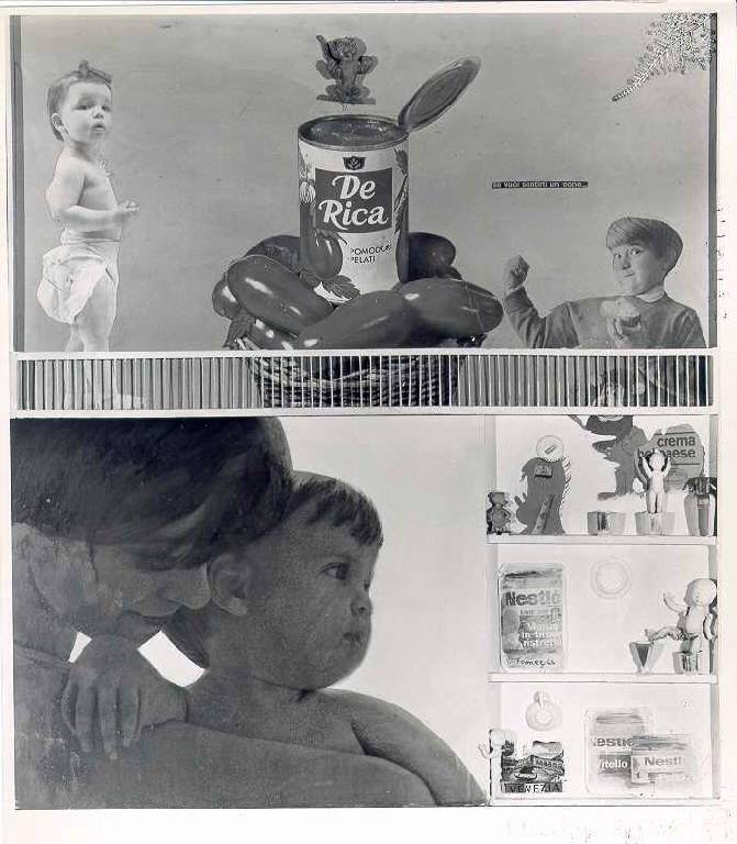 Opera polimaterica in cui il campo compositivo è diviso in due zone parallele e orizzontali separate da una ringhierina di legno. In alto al centro grande scatola di pomodori De Rica aperta con a destra e a sinistra due sorridenti bambini. In basso in primo piano a sinistra mamma con bambino in braccio, a destra su tre ripiani sono appoggiati o rappresentate immagini pubblicitarie di prodotti per l'infanzia. Colore: cromatico; caldo (rosso); sfumato.