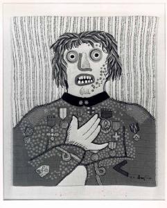 Ritatto d'uomo a mezzo busto e frontale realizzato con stoffe e ricami, deformato nel volto e nelle parti anatomiche. Il piano di fondo è a righe verticali. Colore: cromatico; caldo; piatto. Struttura: statica.