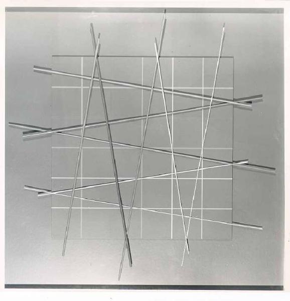 Opera pittorica costituita da una composizione di linee dipinte e a rilievo sovrapposte secondo direttrici diagonali che escono dai limiti della tela.\nColore: cromatico; caldo; piatto. Stesura: uniforme; a rilievo. Linea grossa, continua, uniforme. Struttura: dinamica.