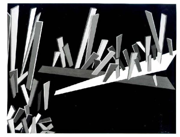 Opera pittorica caratterizzata dalla composizione di figure geometriche in campo scuro e uniforme e secondo direttrici diagonali che conferiscono l'idea di un movimento spaziale. La stesura è uniforme e la struttura è dinamica. La luce è contrastata e laterale.