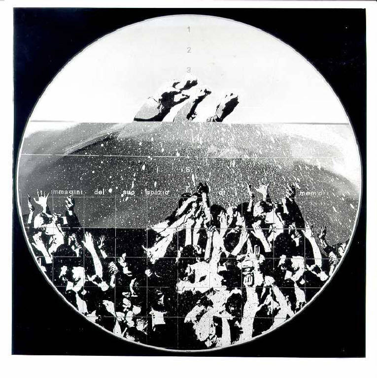 Opera pittorica in cui in primo piano una grande folla con i pugni e le mani alzate è inquadrata da un mirino di un fucile pronto a sparare. Nel piano di fondo alcuni pugni simbolici di grandi dimensioni. Il colore è tonale; freddo (azzurro); sfumato. La stesura è uniforme. Vi sono delle scritte in orizzontale, a stampatello, manuali. La luce è contrastata.