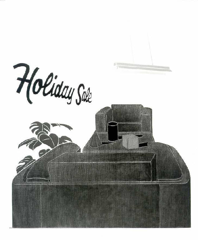 La tela, disposta verticalmente, raffigura la veduta interna di una stanza arredata con due poltrone marroni affrontate con alti braccioli e schienale basso, separate da un tavolino sul quale sono appoggiati dei solidi (cilindro, piramide, cubo) di colori diversi. Ad accentuare la visione prospettica contribuisce l'inserimento di una pianta di edera dipinta sul fianco sinistro dell'opera, che mostra chiaramente le scelte compositive operate da Tadini per cercare di ingannare l'occhio dell'osservatore. Le pareti della stanza sono spoglie e dipinte di azzurro.\nSulla sinistra del quadro si trova una scritta in lingua inglese "Holiday Sale", mentre dal soffitto scende una lampada al neon che illumina la scena. La stesura del colore è piatta e uniforme, mentre la scrittura manuale e in corsivo segue un andamento diagonale.