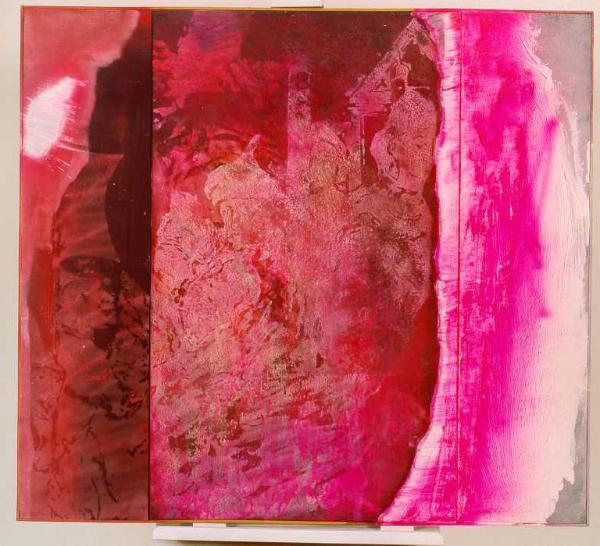 L'opera è pensata a trittico. Nel pannello centrale in primo piano sono riconoscibili frammenti di figure tratte dagli affreschi di Viboldone. In secondo piano chiude la scena una chiesa. Nei pannelli laterali elementi cromatici informali e luminosi. Il colore è tonale; caldo (rosso, rosa); freddo (viola). La stesura è sottile e ad aerografo. La luce è frontale e contrastata.