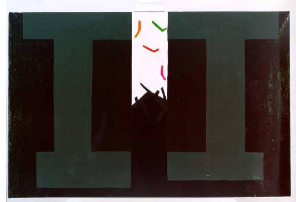 Opera in cui lo spazio compositivo è diviso in forme geometriche rettangolari contrapposte. Al centro in alto un rettangolo bianco con segni cromatici apre e movimenta l'opera. Il colore è acromatico (nero, bianco).\nLa stesura è sottile, uniforme. La luce è contrastata.