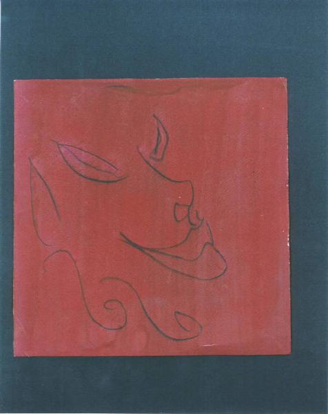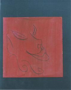 Opera pittorica che rappresenta in un campo rosso quadrato, a brevi tratti, un volto con grandi occhi e labbra accentuate.\nIl colore è tonale; caldo (rosso); piatto. La luce è unforme.