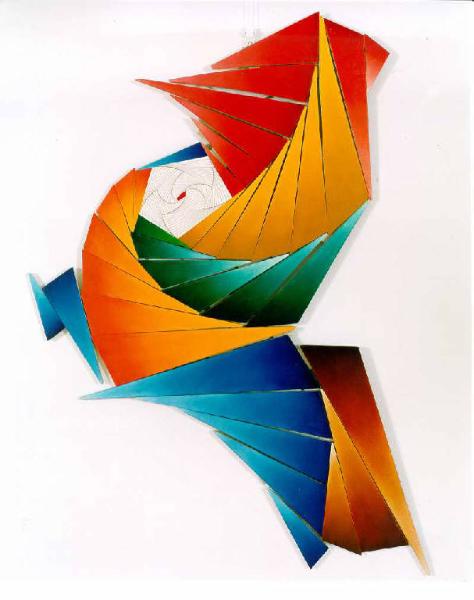 Opera costiutita da una composizione mobile di elementi triangolari di diverse dimensioni e colori componibili in infinite variazioni. Il colore è caldo (giallo, arancio, rosso, bruni); freddo (azzurro, verde). La stesura è sottile; uniforme; piatta.