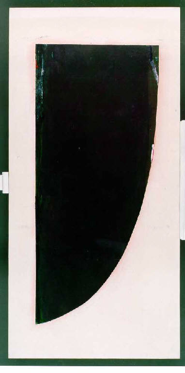 Opera pittorica che rappresenta una grande forma geometrica scura triangolare con il lato lungo arrotondato collocato su un fondo bianco modulato da piccoli mutamenti cromatici. Il colore è tonale; freddo (viola, bianco, verde). La stesura è uniforme e piatta. La struttura è statica.