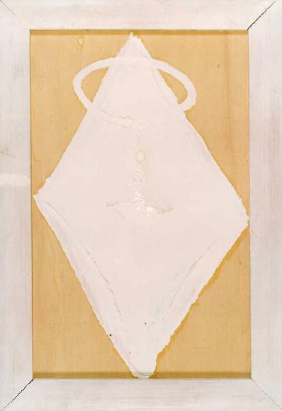 Opera pittorica che rappresenta all'interno dello spazio compositivo rettangolare un rombo non regolare bianco, caratterizzato da una materia più spessa al centro e da un cerchio aprospettico sul vertice superiore.\nIl colore è tonale, freddo (bianco). La stesura è a rilievo; variata; stratificata. La luce è diffusa.