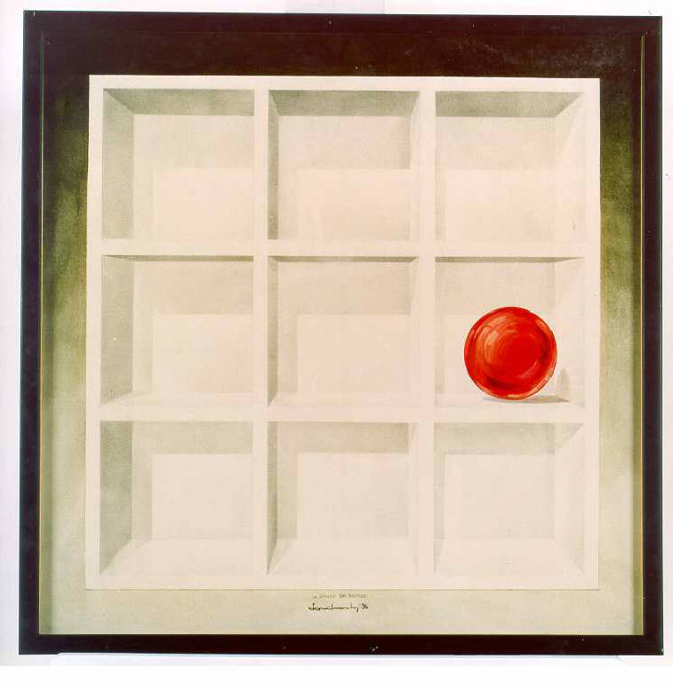 Su una scaffalatura bianca perfettamente geometrica è collocata al centro a destra una sfera rossa. Il colore è acromatico (bianco) e caldo (rosso).\nLa stesura è sottile; tesa; velata. La luce è contrastata.