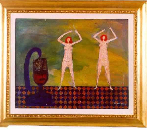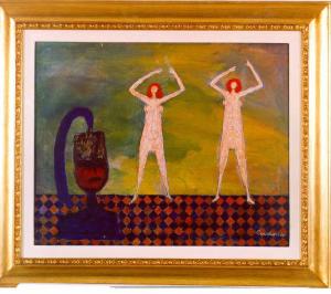 Opera pittorica che rappresenta in primo piano a destra due figure femminili, trattate sinteticamente che si dispongono in piedi con le braccia alzate sopra la testa. A sinistra una scultura antropomorfa. Il colore è tonale, caldo (rosso, arancio); freddo (verde, viola). La stesura è stratificata; tesa.\nLa struttura è statica (linee-forza orizzontali, linee-forza verticali). La luce è contrastata.