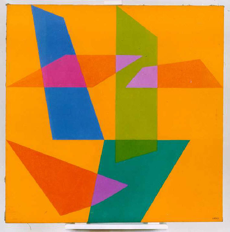 Forme geometriche poligonali regolari e irregolari sono sovrapposte una sull'altra, secondo un andamento verticale, per creare un effetto di trasparenza cromatica.\nColore: cromatico; caldo (rosso, arancio, giallo); freddo (bleu, azzurro, viola); piatto; velato. Stesura: tesa; uniforme. Luce: frontale; uniforme.